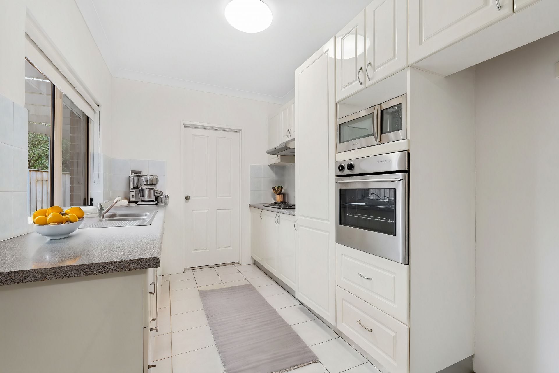 Tidy kitchen with stainless steel appliances and separate internal laundry